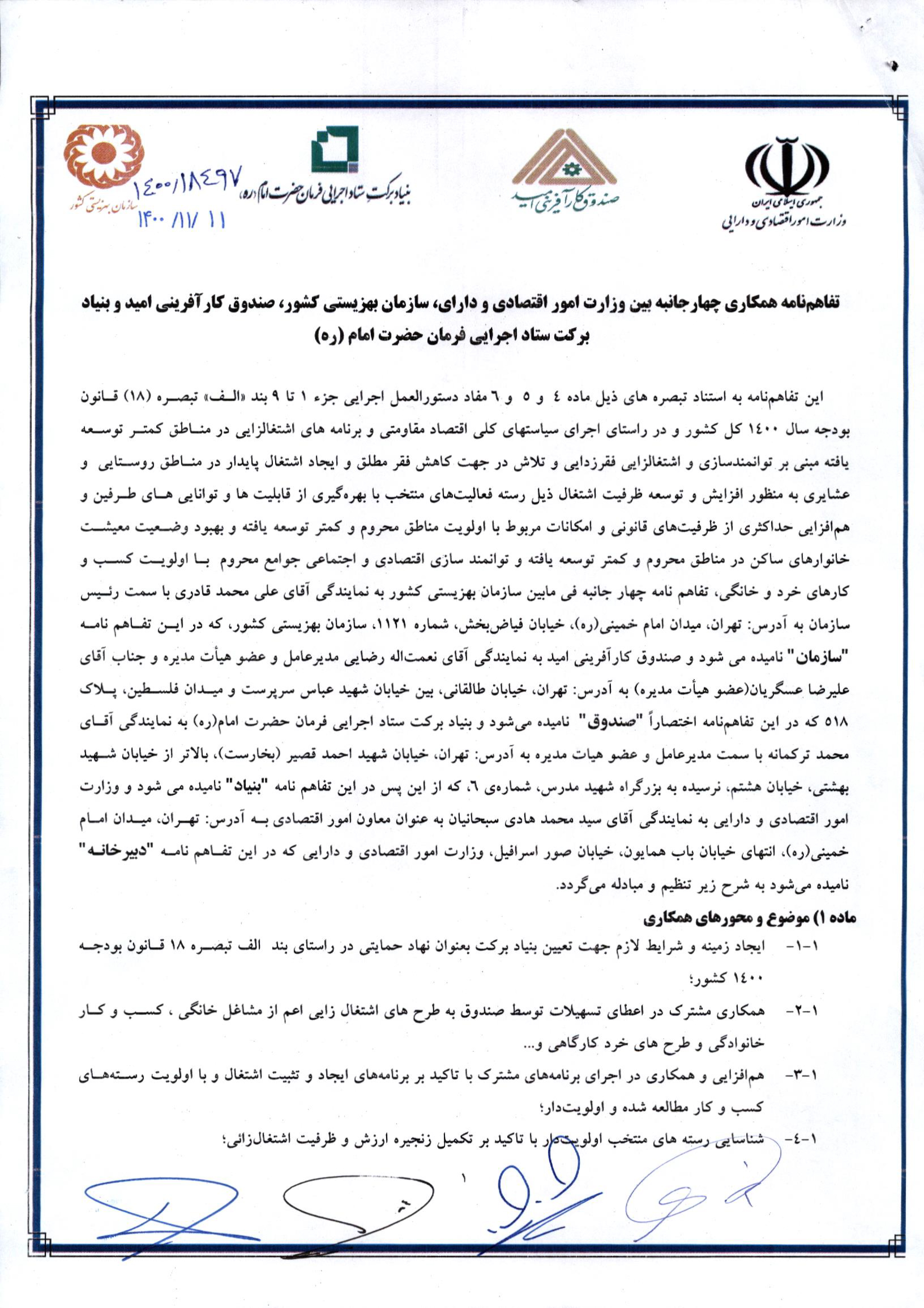 jpg تفاهم نامه چهارجانبه صندوق کارآفرینی امید، بهزیسنی، وزارت اقتصادی وامور دارایی، بنیاد برکت ۲.۵۱ مگابایت دریافت فایل